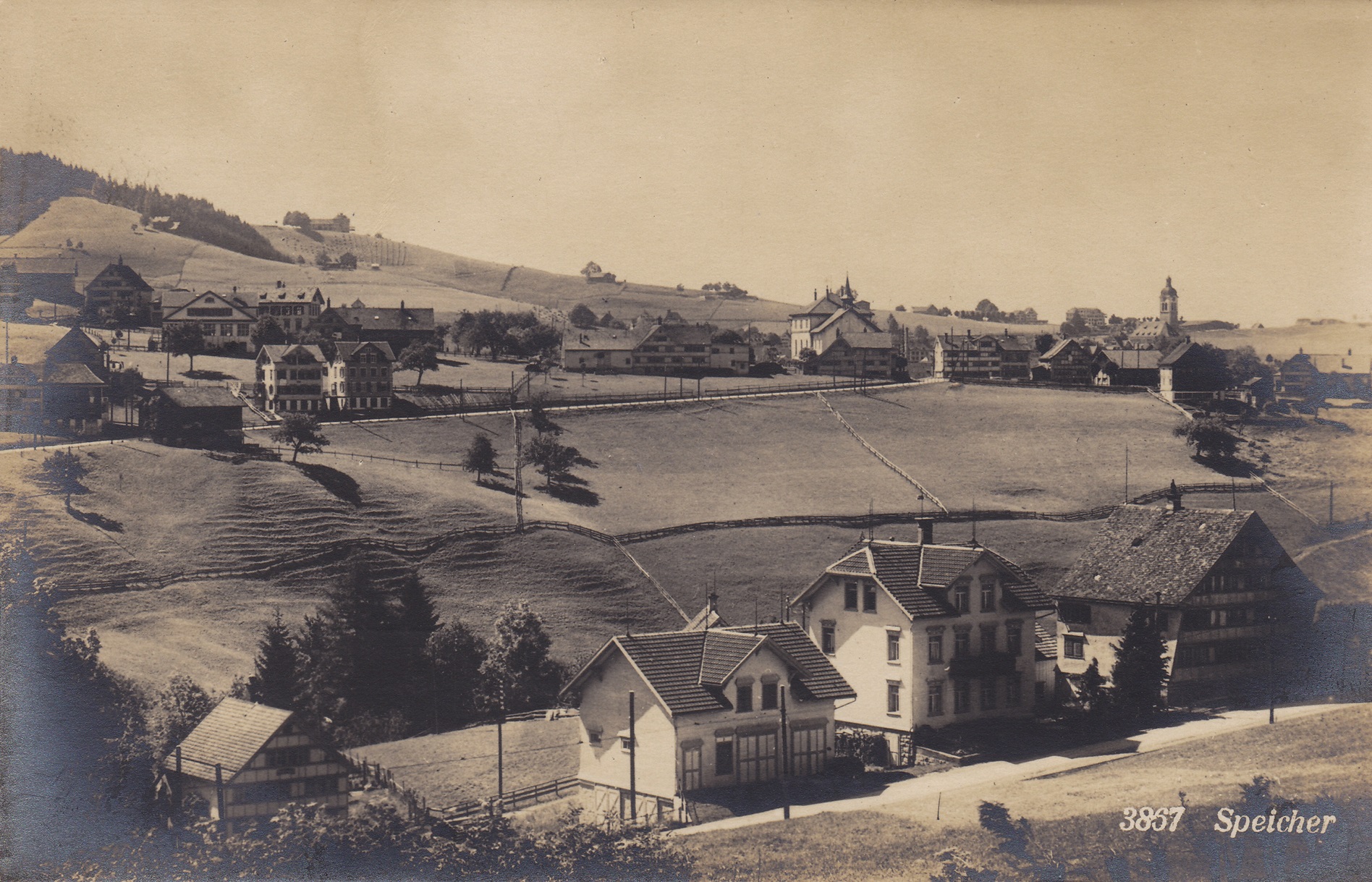 (Sägli und Bendlehn vom Gfeld-Trogen her gesehen<br> <br> Nr.: 3867<br> Datum: um 1935<br> Verlag: Frei & Co., St. Gallen<br> Quelle: Edy Tanner<br> Beitrag:<br> Färberei Sägli<br> Stickerei Altherr<br> Luftkampf über Speicher<br> <br>)